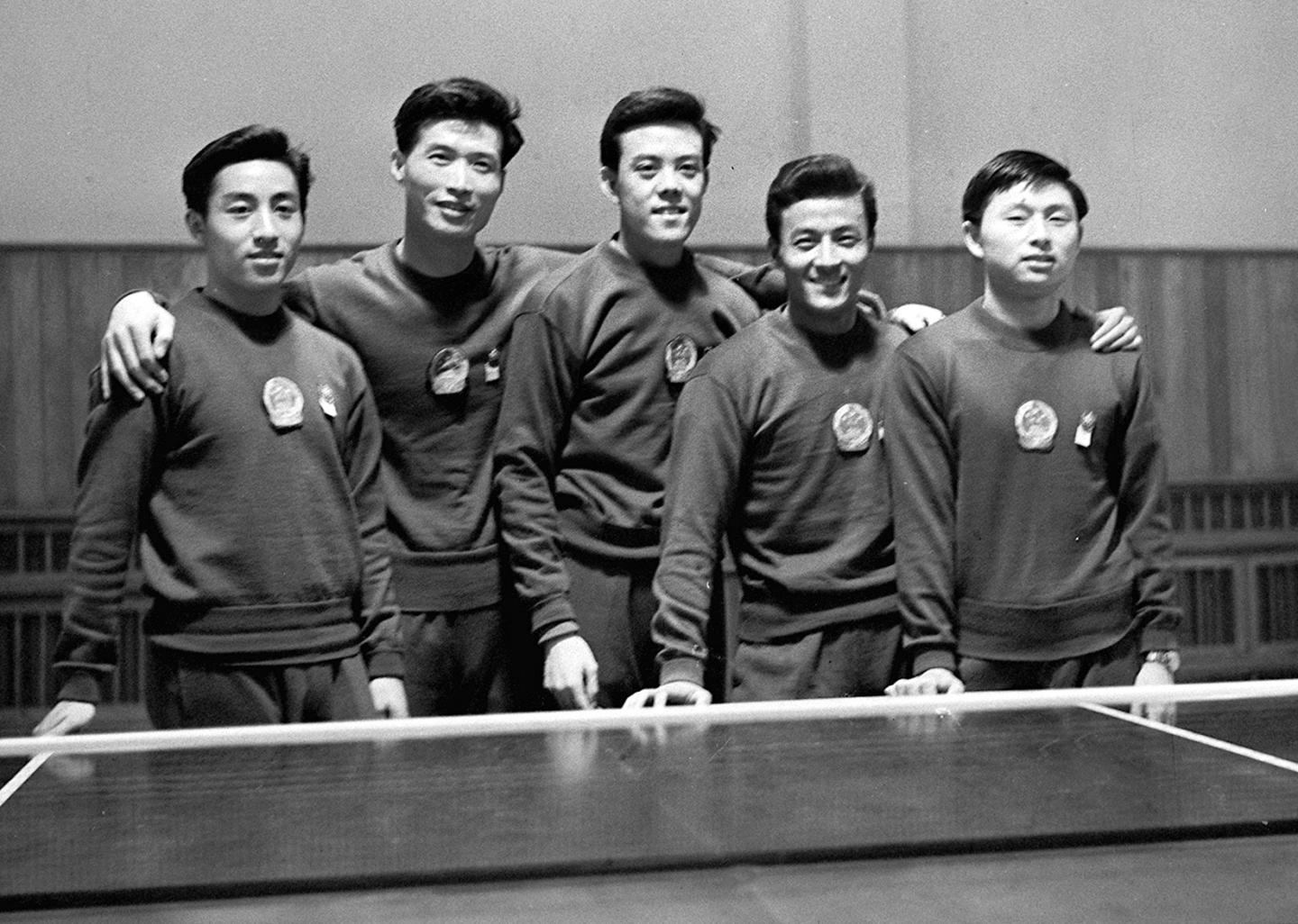 1961年4月9日,中国男子乒乓球队荣获第26届世界乒乓球锦标赛男子团体冠军。这是参加男子团体赛的5名中国选手合影。自左至右:庄则栋、王传耀、容国团、李富荣、徐寅生。新华社记者 张家骅 摄