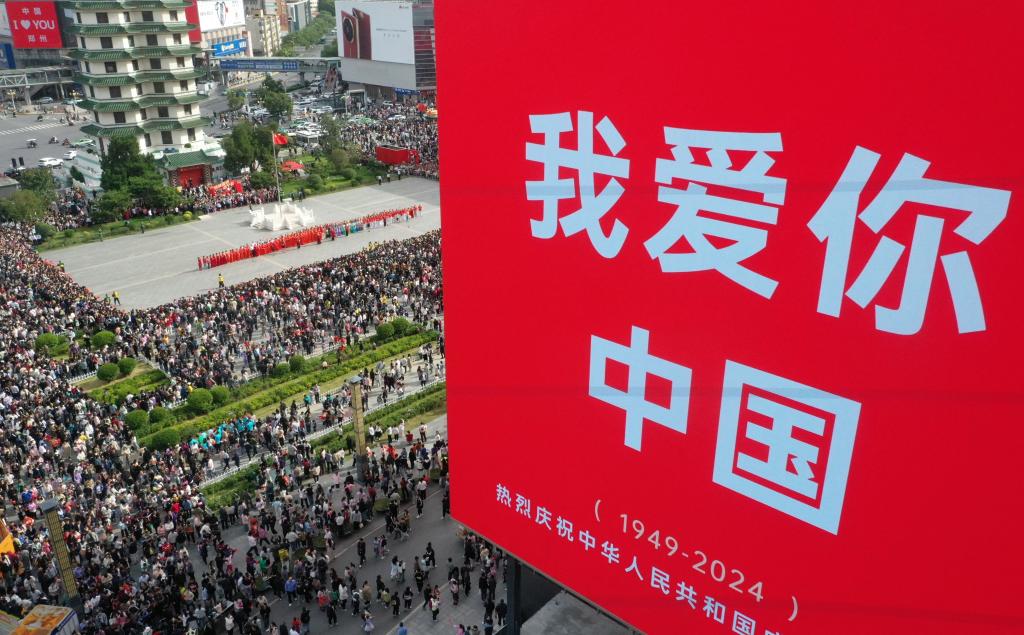 2024年10月1日,人们在河南省郑州市二七广场观看升旗仪式后的演出(无人机照片)。新华社记者 李嘉南 摄