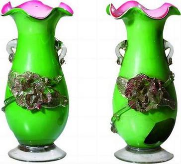 这是一对玻璃花瓶,瓶身通体翠绿,瓶口透着盈盈粉色,宛如荷花亭亭玉立。瓶身饱满,镶有透明双耳和花朵造型,玲珑剔透中带有一丝浪漫气息。