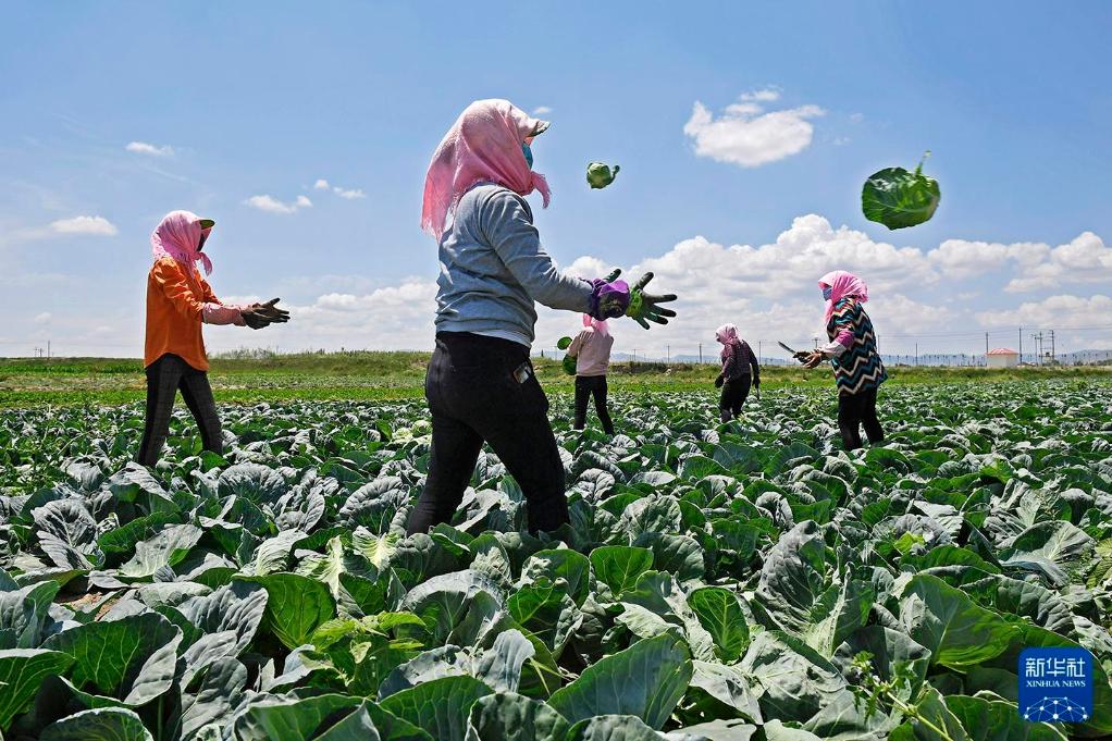 2017年6月30日,宁夏固原原州区彭堡镇姚磨村村民在蔬菜基地收获圆白菜。新华社记者 王鹏 摄
