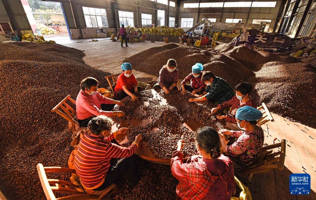 2020年11月8日,贵州铜仁松桃苗族自治县农民在蓼皋街道一家油茶加工厂分选油茶籽。新华社发(龙元彬 摄)