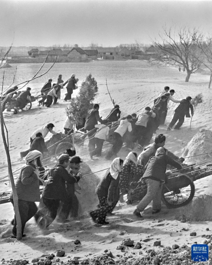 焦裕禄带领河南兰考干部群众治理风沙、内涝、盐碱“三害”,改变兰考面貌。图为兰考人民在运淤泥封住沙丘。(1966年7月29日发)新华社发