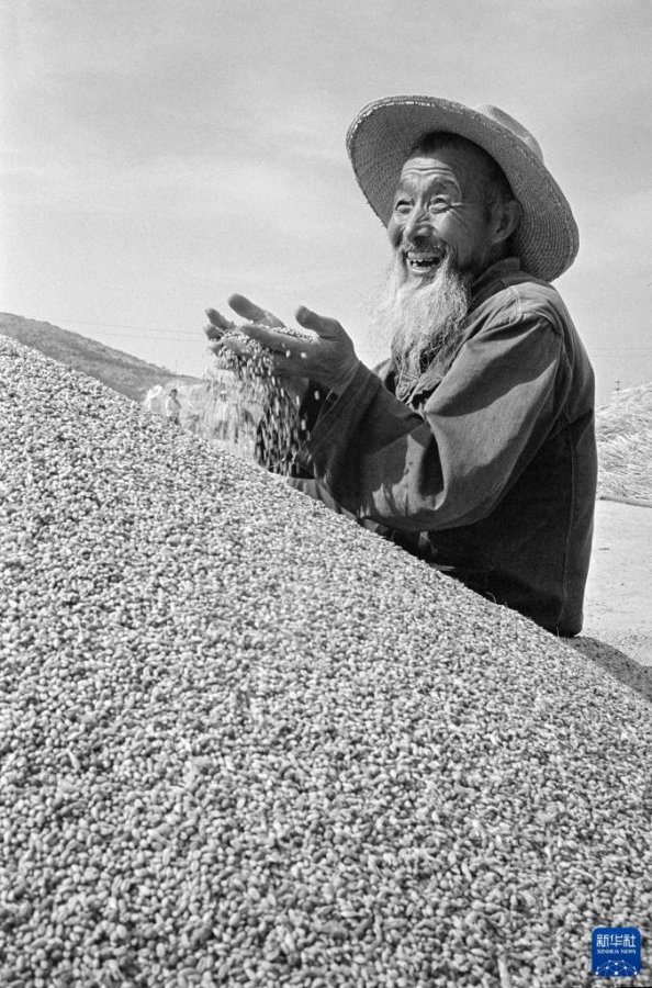 江苏连云港朝阳公社66岁的张汝栋在打麦场上手捧丰收的麦粒。(1973年7月16日发)新华社发