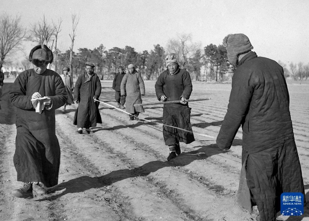 1950年,北京市郊土地改革时农民在丈量土地。当年6月28日,中央人民政府委员会通过了《中华人民共和国土地改革法》。新华社记者 王纯德 摄