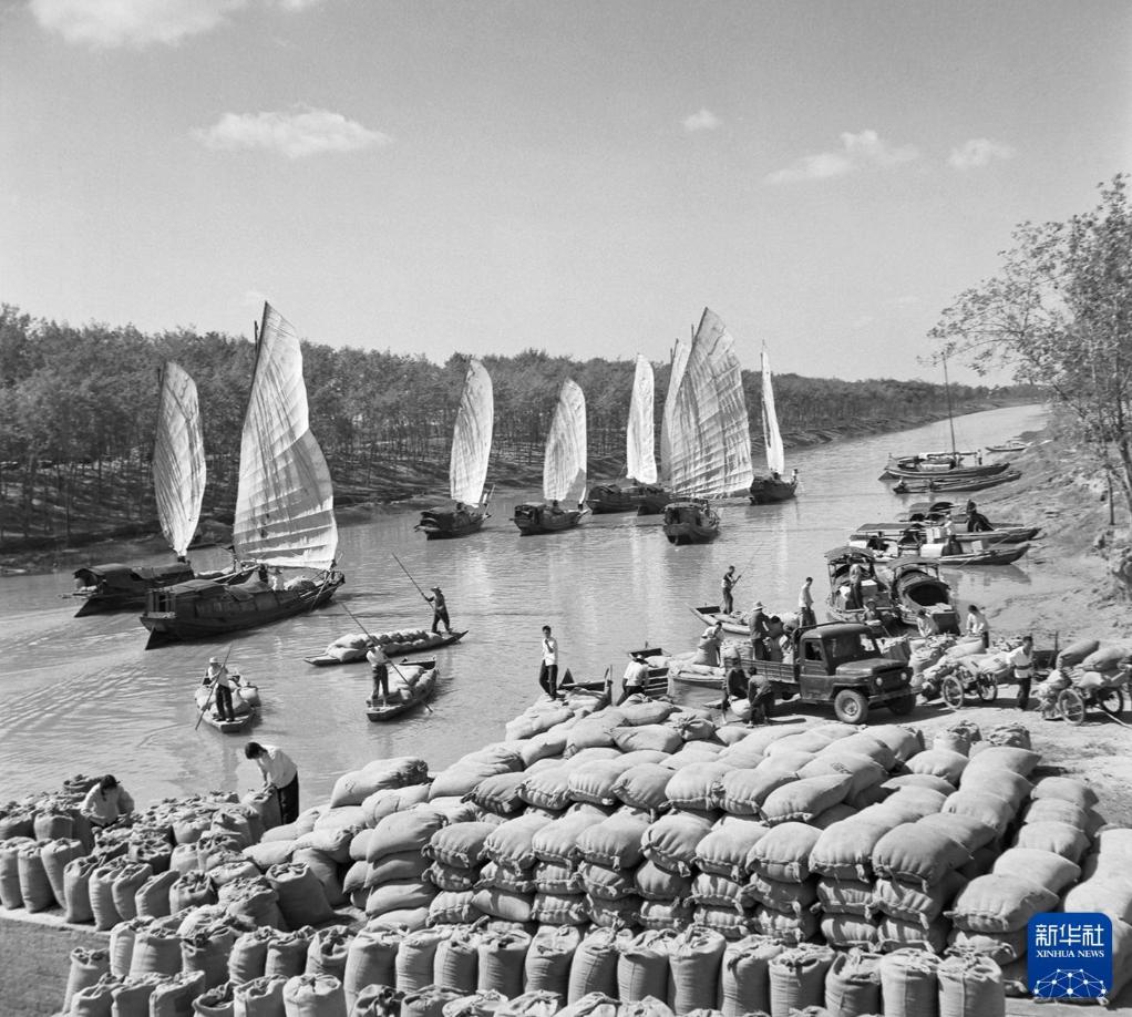 1975年1月25日,湖北潜江县莲市、周矶等公社社员在装运向国家交售的粮食。新华社发