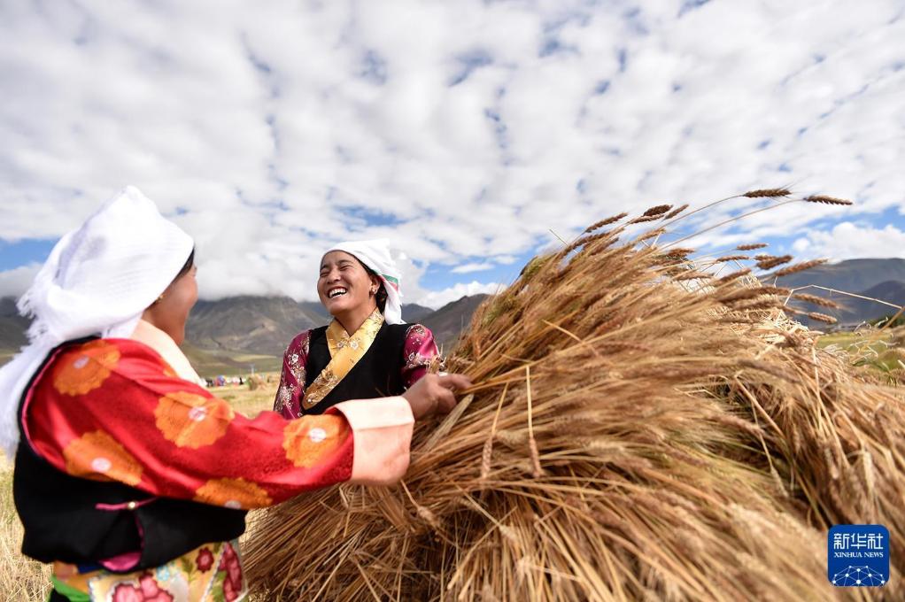 2018年9月23日是首个中国农民丰收节,西藏拉萨林周县松盘乡松盘村农民在田间聊天时开怀大笑。新华社记者 觉果 摄