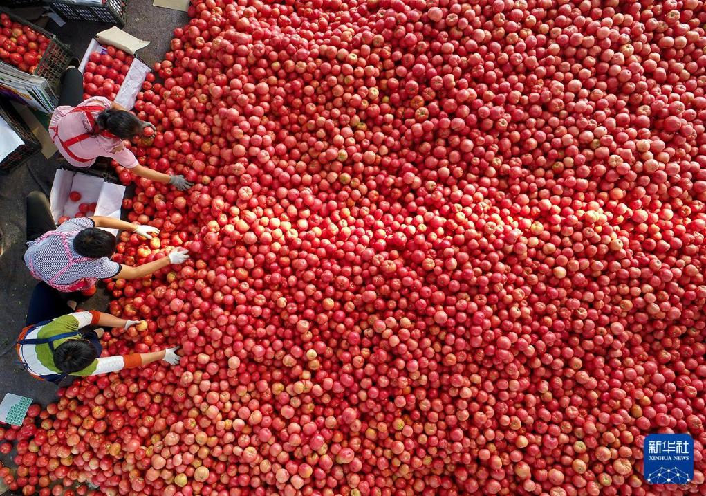 2017年9月21日,河北滦州小马庄镇农民在一处蔬菜基地内将采摘的西红柿装箱。新华社记者 牟宇 摄