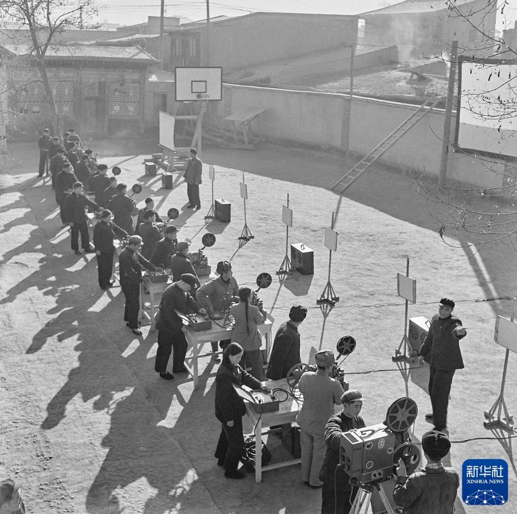 1955年12月,甘肃文化局主办的电影放映训练班上,学员们在检查电影放映机和电影片。新华社记者 赵淮青 摄