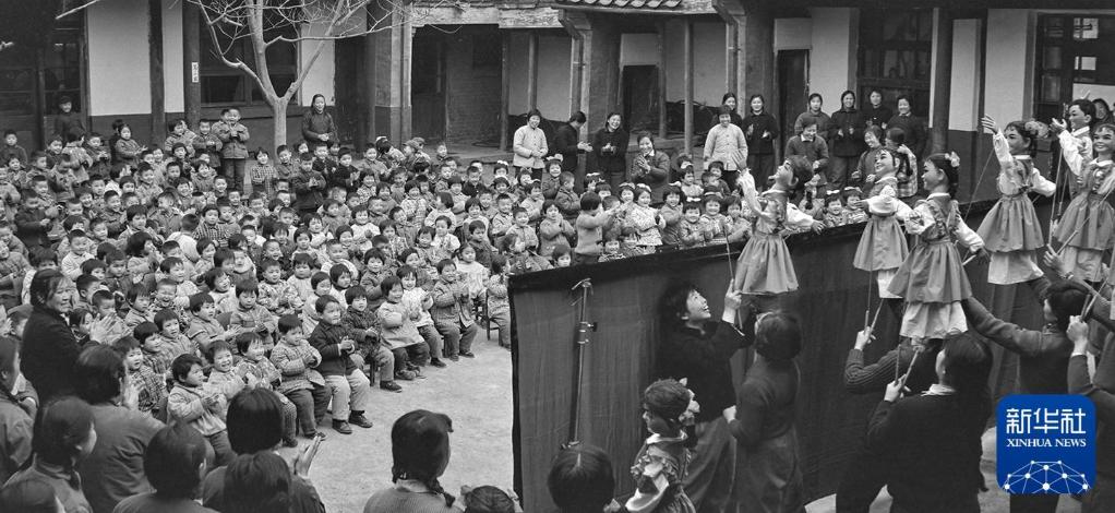 1972年4月27日,北京木偶剧团成员在市第一幼儿园为小朋友们演出。新华社发