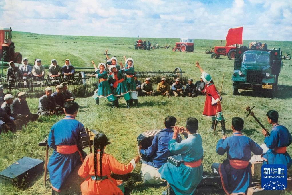 20世纪70年代,内蒙古锡林郭勒盟乌兰牧骑队员在草原上为牧民演出。新华社发