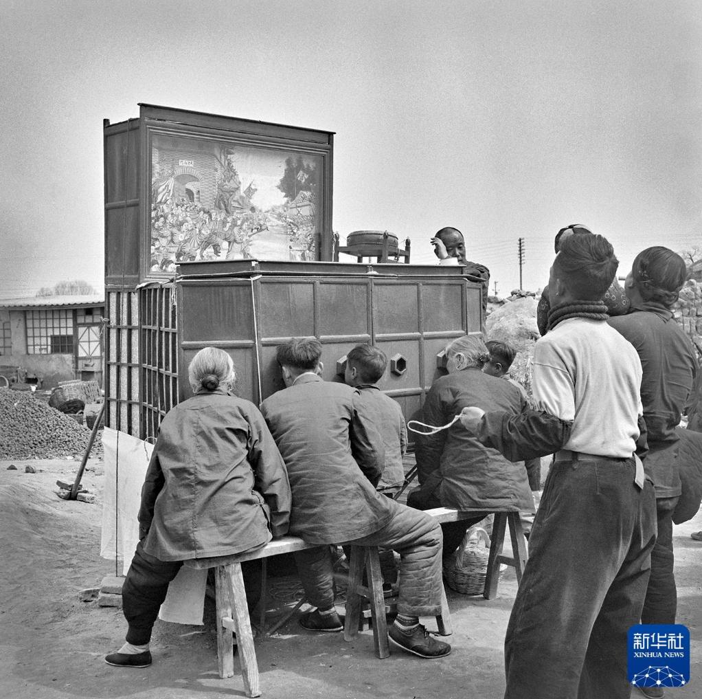 1957年4月,人们在北京蟠桃宫庙会上观看拉洋片。新华社发