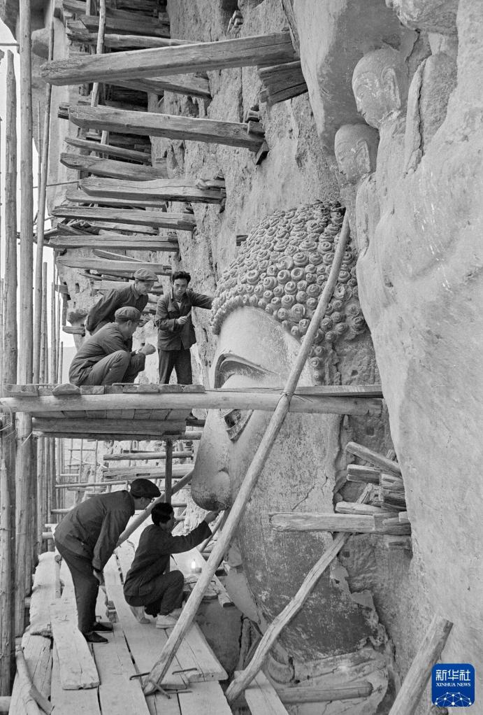 甘肃麦积山文物研究所会同敦煌莫高窟和省博物馆的专业技术人员研究修复麦积山石窟大佛。(1982年12月7日发)新华社记者 李生才 摄