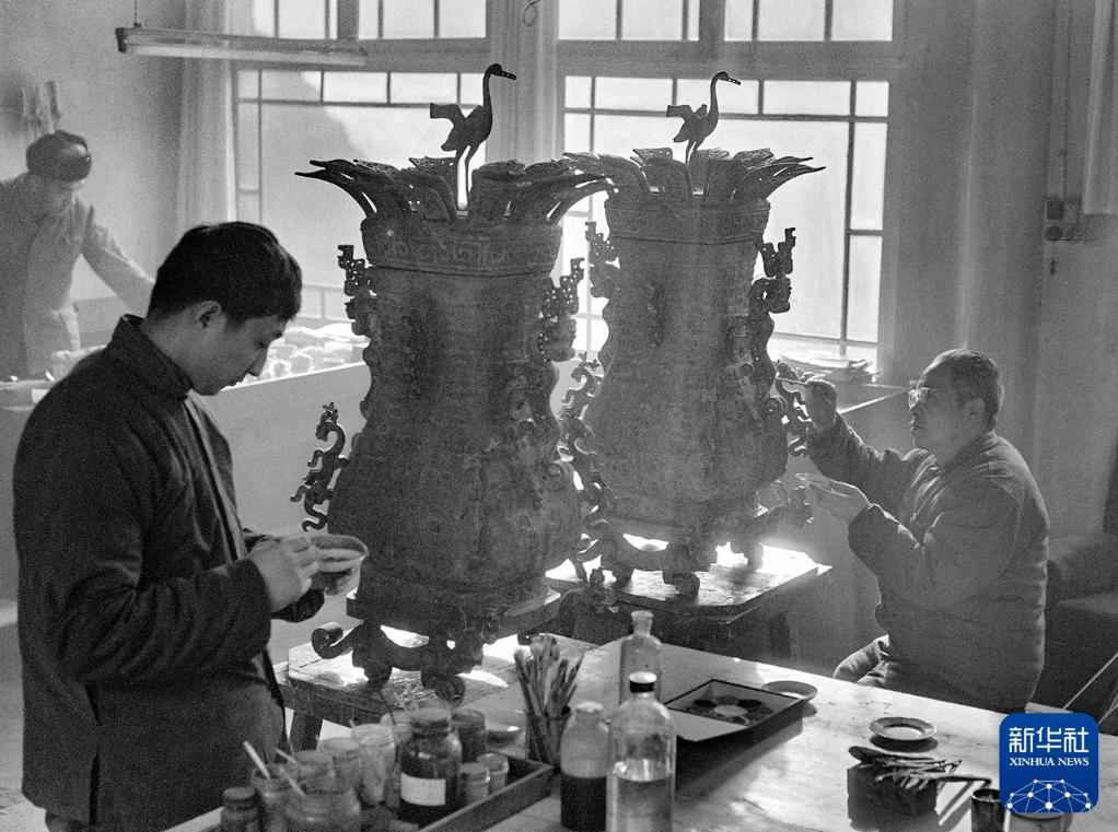 故宫博物院文物修复厂青铜组的工人在复制春秋时期的青铜莲鹤方壶。图中左边的一只是原件,右边的是复制品。(1978年6月5日发)新华社记者 韩居策 摄