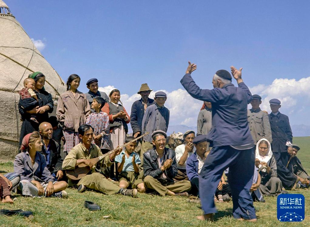 1964年8月30日,新疆伊犁哈萨克自治州牧民在赛里木湖畔欢乐歌舞。新华社记者 穆青 摄