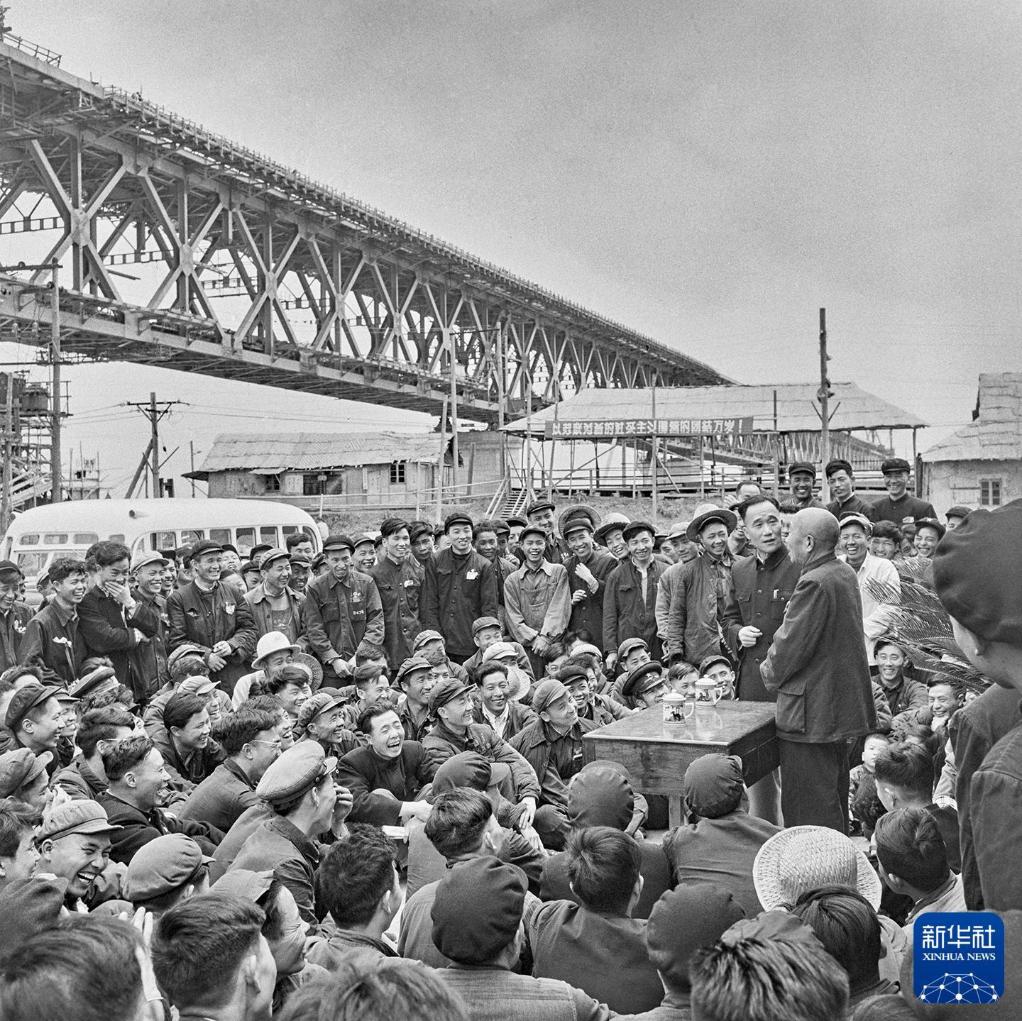 1957年4月,著名相声演员侯宝林、郭启儒于武汉长江大桥合龙前夕,在工地向工人们作慰问演出。新华社发