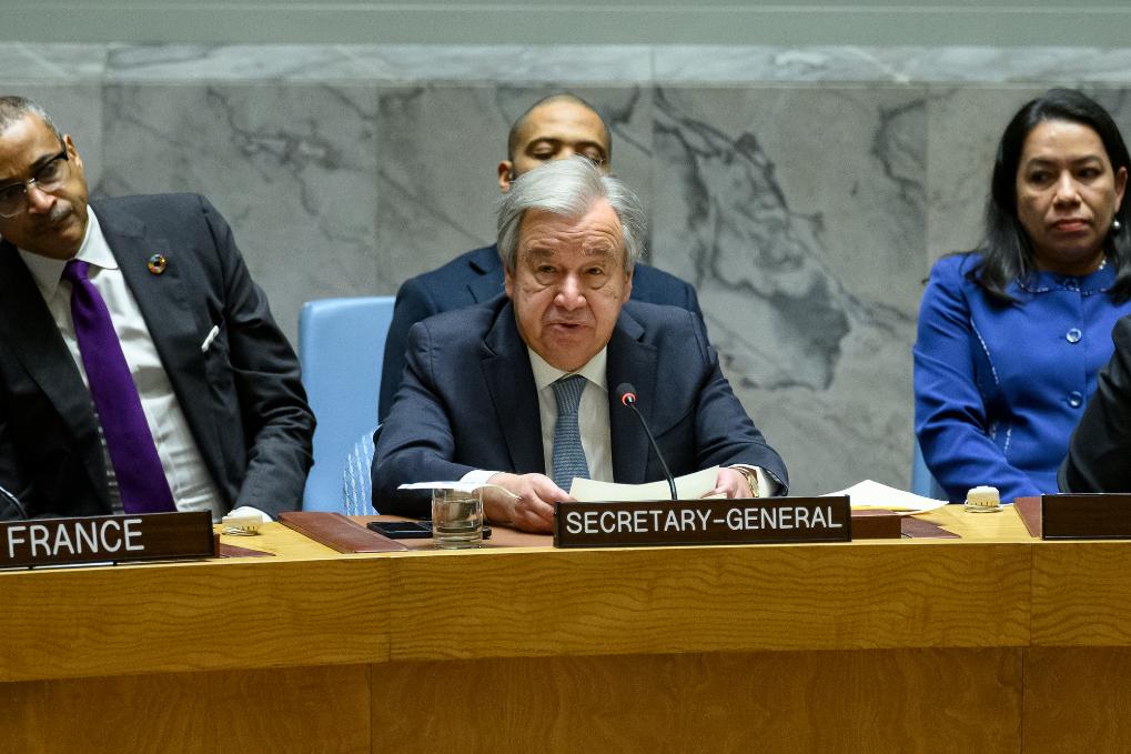 2月13日,在位于纽约的联合国总部,联合国秘书长古特雷斯(中)出席安理会气候、粮食与安全高级别公开辩论会。新华社发(联合国供图/洛伊·费利佩摄)