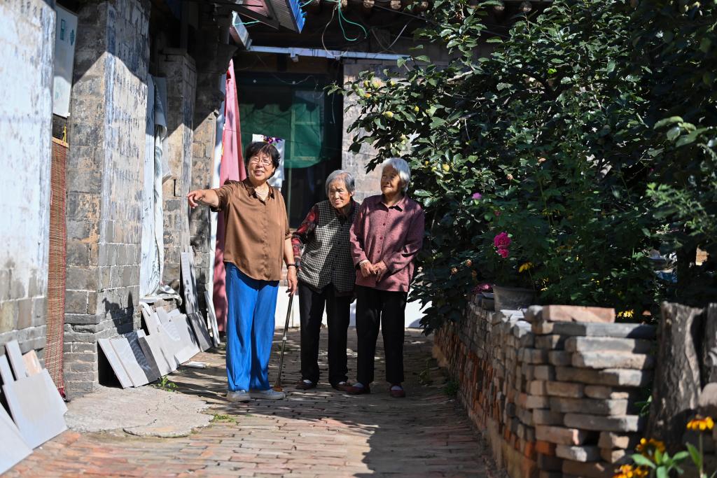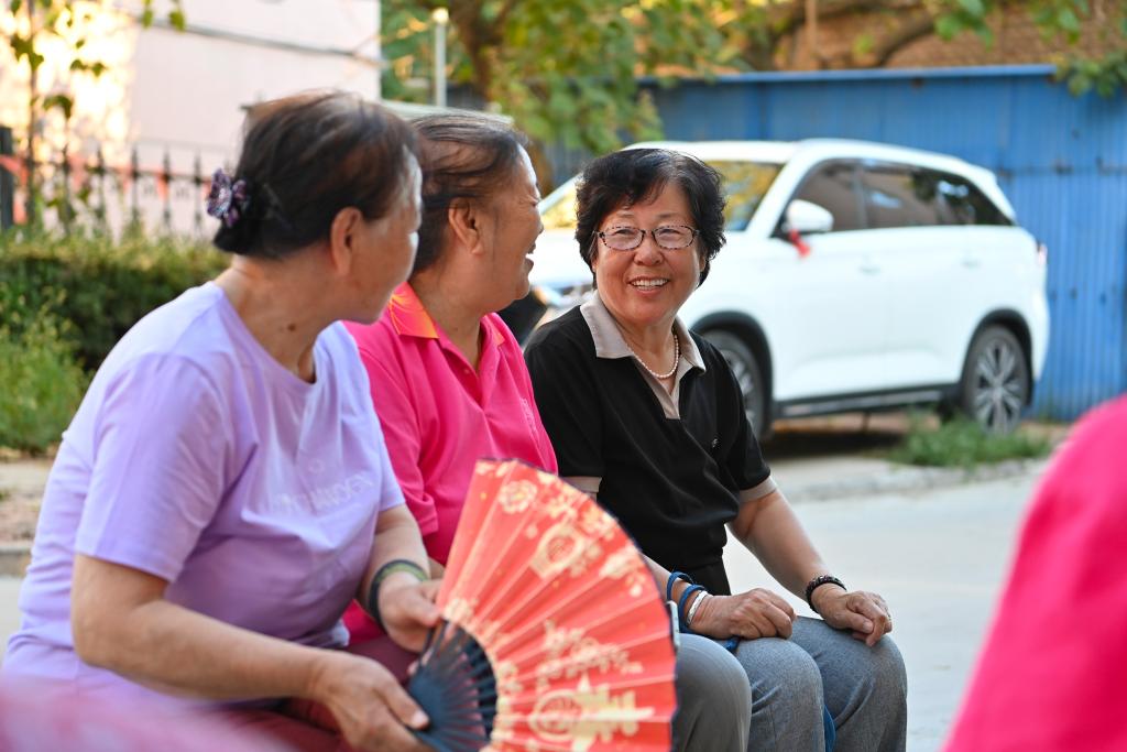 9月19日,张改英(右)和街坊邻里在晋中市太谷区太纺社区聊天。