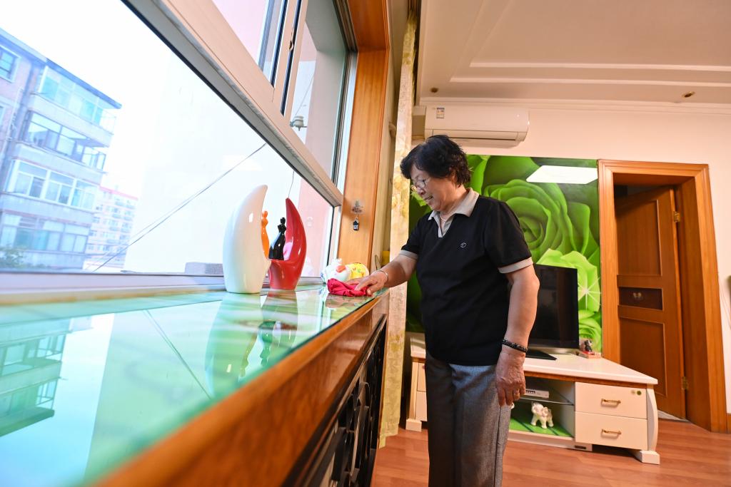9月19日,张改英在位于晋中市太谷区太纺社区的家里打扫卫生。