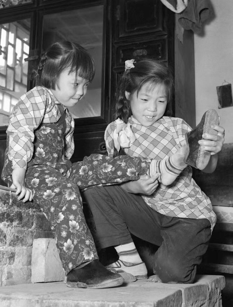那是1957年,山西省太谷县(今晋中市太谷区)南沙河村的农业生产合作社取得好收成,村里准备搭台唱戏。听说这个消息,孩子们奔走相告。11岁的张改英赶忙为5岁的妹妹张爱英换上胶鞋。看到姐妹俩可爱俏皮的神情,正在家里采访的新华社记者忍不住按下快门,定格了这温情而纯真的一幕。