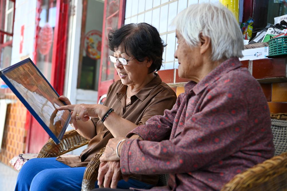 9月19日,山西省晋中市太谷区南沙河村,张改英(左)和大姐张采英查看老照片,回忆往事。
