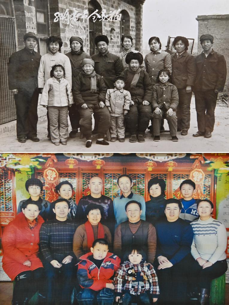 上图为张改英一家拍摄于1984年的合影,后排左二为张改英,后排右二为妹妹张爱英,前排右二为父亲张拴保;下图为张改英一家拍摄于2009年的合影,第二排左三为张改英(资料照片)。