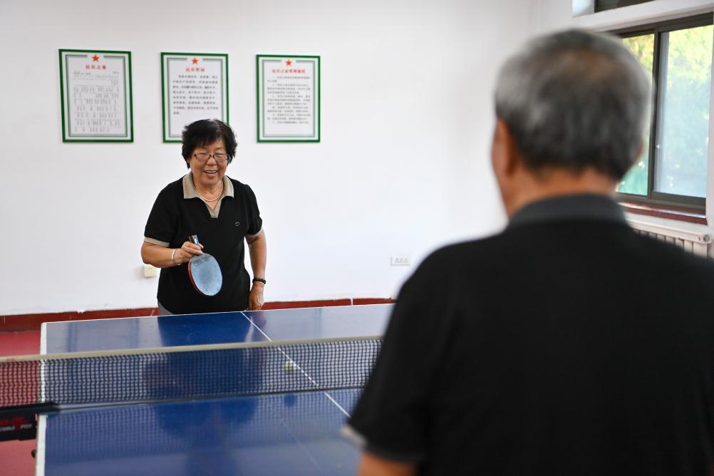 9月19日,张改英和老伴史鸿彰在晋中市太谷区太纺社区党群服务中心的活动室打乒乓球。