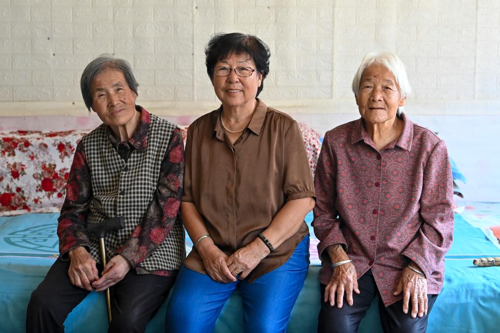9月19日,山西省晋中市太谷区南沙河村,张改英(中)和大姐张采英(右)、二姐张转英在曾经居住过的老房子里合影。