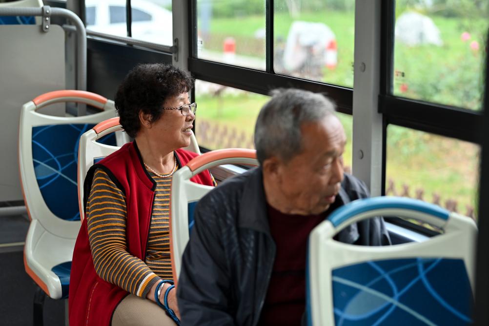 9月27日,在晋中市太谷区,张改英(左)乘坐免费公交。