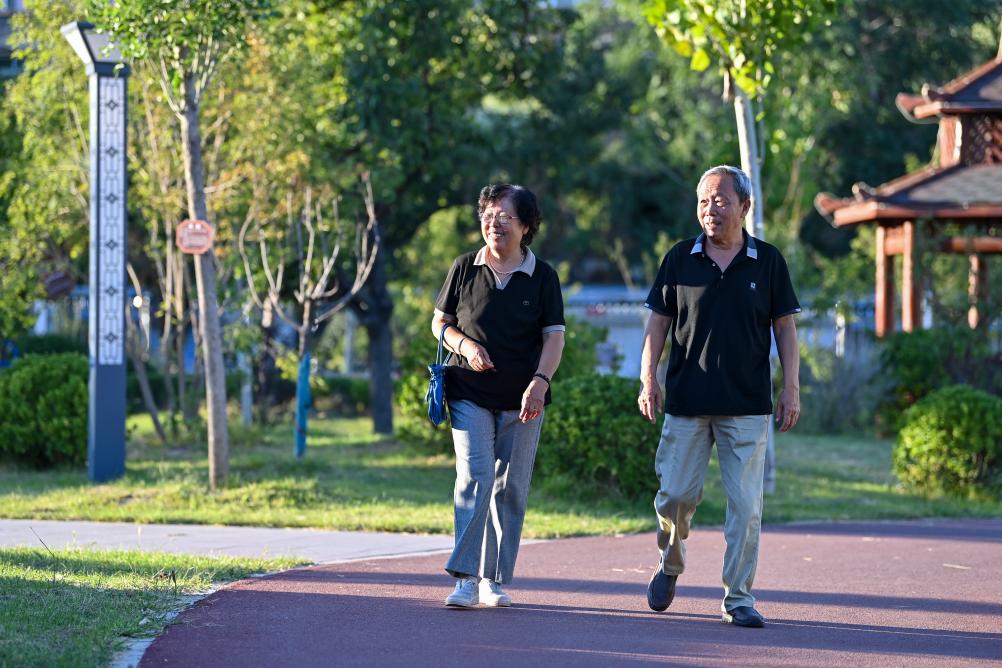 9月19日,张改英(左)和老伴史鸿彰在晋中市太谷区太纺社区的公园里散步。