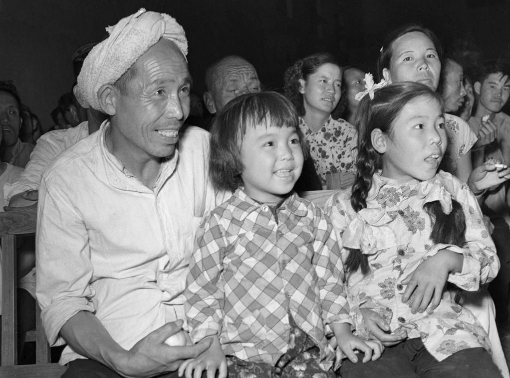 山西省太谷县新联社的社员张拴保(前左一)带着女儿张改英(前右一)姐妹俩看戏(资料照片)。新华社记者 张瑞华、周树铭 摄