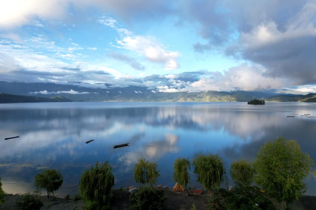 早晨的泸沽湖湖面如镜。(宋明 摄)
