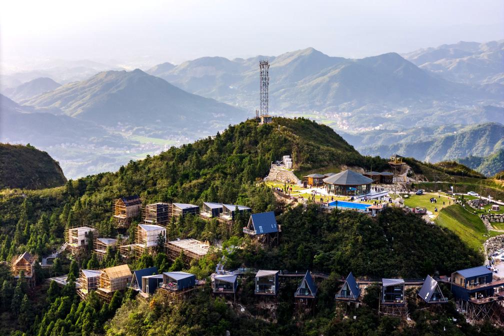 沿盘山公路驱车上行,至海拔800余米的紫云峰山顶,云雾缭绕中,依山“悬空”而建的民宿、步道,使游客们能将山色云海尽收眼底,获得“置身云端”的独特体验。