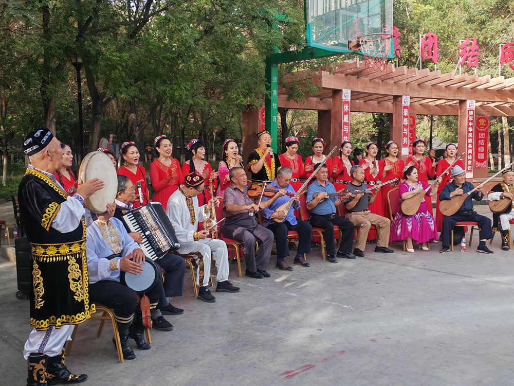 2024年9月19日,新疆库尔勒市朝阳街道团结社区石榴籽乐团在为居民们表演。新华社记者 顾煜 摄
