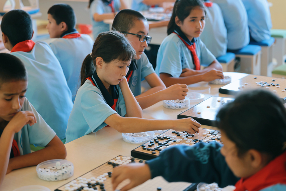 2024年9月23日,在新疆乌什县依麻木镇国家通用语言学校,学生们在下围棋。新华社记者 任沁沁 摄