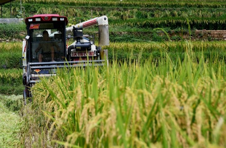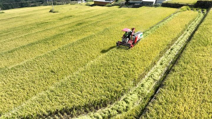 2024年9月11日,在凉山州会理市鹿厂镇的水稻现代农业园区,农业机械在收割稻谷。新华社记者 高健钧 摄
