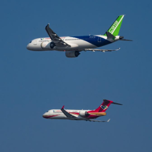 记者从中国商飞获悉,11月2日,国产飞机C919和ARJ21在2024中国航空产业大会暨南昌飞行大会上,首次完成双机编队飞行表演。
