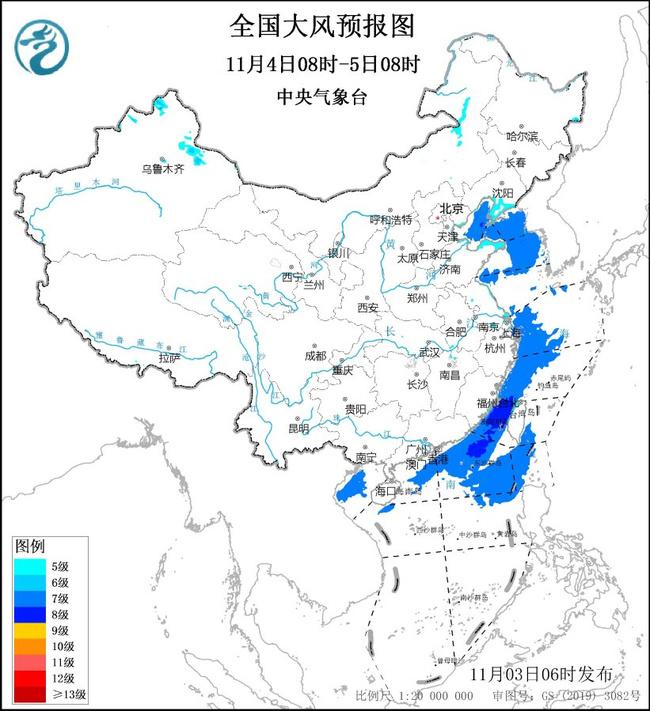 预计,11月3日08时至4日08时,青海北部、内蒙古中部、山西北部、河北北部、天津、辽宁中南部等地将有5~6级、阵风7~8级的大风,沿海地区阵风可达9级;渤海、渤海海峡、黄海北部和中西部、台湾海峡将有7~8级、阵风9~10级的大风。