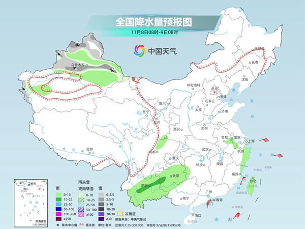 中央气象台预计,今天,新疆北部和南疆西部山区、西藏东北部等地部分地区有小到中雪或雨夹雪,其中,新疆北部高海拔山区和南疆西部山区等地局地有大到暴雪。西藏东南部、川西高原大部、四川中南部、云南、贵州西部、海南岛、台湾岛等地部分地区有小到中雨,其中,云南南部等地部分地区有大到暴雨。