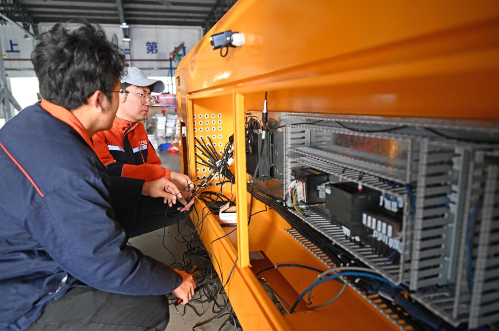 在位于天津市西青区的天津朗誉机器人有限公司生产车间内,工作人员在调试重载自动导引运输车。新华社记者 赵子硕 摄