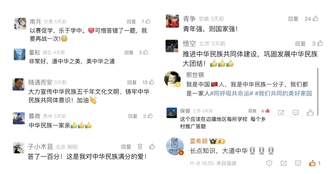 在微信、微博等社交媒体平台,广大网友纷纷留言“以赛促学,乐学于中”“青年强,则国家强!”“长点知识,大道中华”“中华民族一家亲”“答了100分,这是我对中华民族满分的热爱!”,广大网友学习中华民族共同体知识热情高涨!