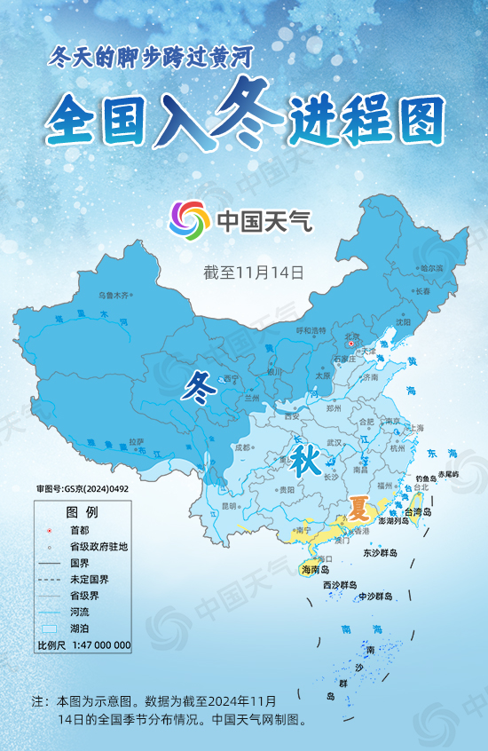 从中国天气网推出的最新全国入冬进程图来看,截至11月14日,我国东北地区大部、新疆、青海、西藏、内蒙古、甘肃、宁夏、陕西北部、山西大部、河北中北部、北京和四川西部等地已经进入气象意义上的冬季,冬季版图已经超过一半国土面积,正式开启冬季称霸时段;南方大部和山东、河南等地处在秋季;而夏季则退到华南沿海一带,仅在海南、广东、广西和台湾等地的部分地区留守,顽强演绎着我国的地域辽阔。