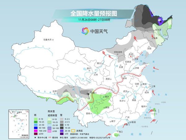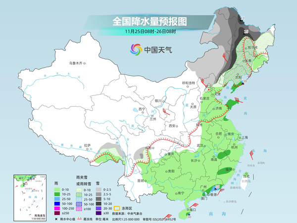 今天(11月25日)起,寒潮天气将继续东移南下影响我国,降温影响进入主力时段,中东部大部气温将陆续创下半年来新低,其中北方多地降温幅度大,并伴有大风天气,风寒效应明显。与此同时,中东部仍有大范围雨雪天气,东北等地降水发展增强。