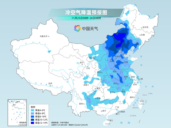 今天起寒潮大举南下,降温影响进入主力时段。中央气象台预计,11月25日至28日,我国中东部大部地区气温将先后下降6至10℃,其中,华北北部、内蒙古中部及东北地区等地部分地区降温12至14℃,局地16℃以上。今晨,中央气象台继续发布寒潮黄色预警。