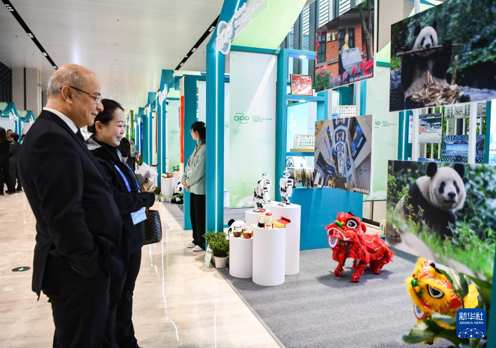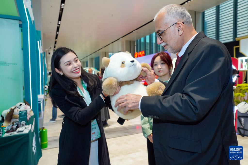 11月26日,嘉宾在会场观看大熊猫玩偶。新华社记者 胥冰洁 摄