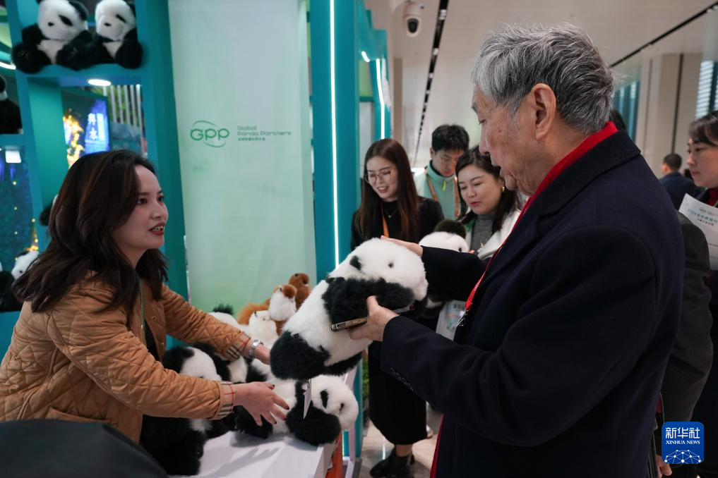 11月26日,嘉宾在2024全球熊猫伙伴大会会议间隙参观大熊猫文创产品。新华社记者 江宏景 摄