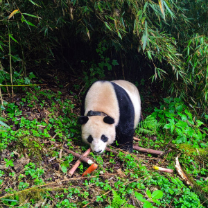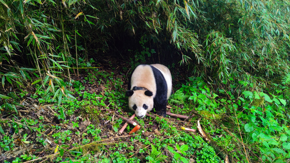 2024年6月9日,在位于大熊猫国家公园卧龙片区内天台山的大熊猫第二阶段野化培训场内,母熊猫“辉辉”准备吃投喂的竹笋和胡萝卜。新华社发(牟仕杰 摄)