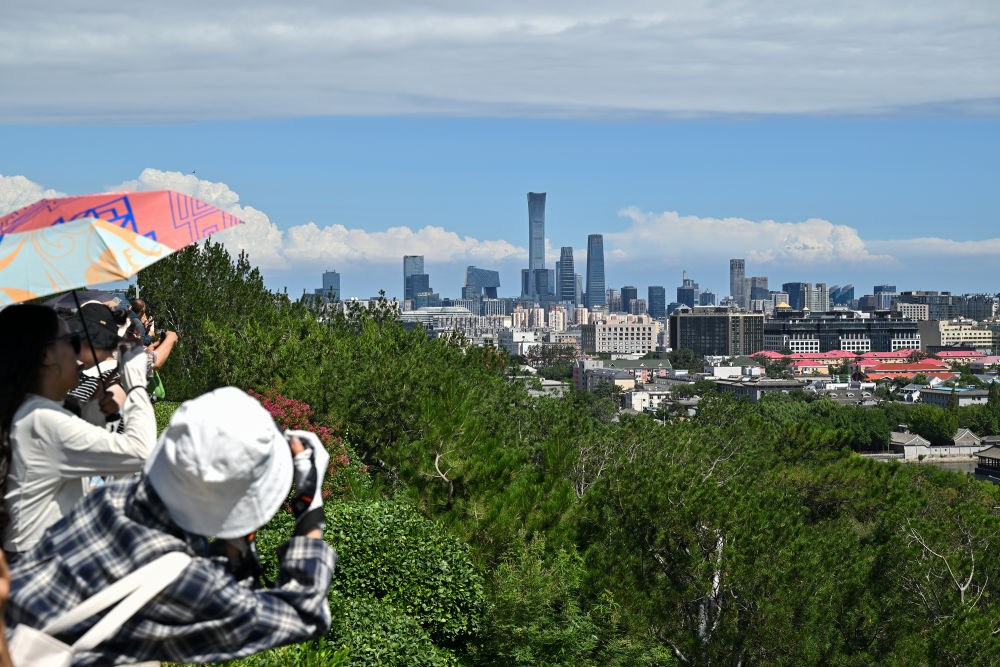 2024年8月12日,游客在景山上拍摄北京国贸附近建筑群。新华社记者 李鑫 摄