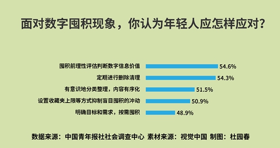 调查中,54.6%的受访者认为囤积前要理性评估判断数字信息价值,54.3%的受访者建议定期进行删除清理,51.5%的受访者建议有意识地分类整理,内容有序化,50.9%的受访者认为要通过设置收藏夹上限等方式抑制盲目囤积的冲动,48.9%的受访者建议明确目标和需求,按需囤积。