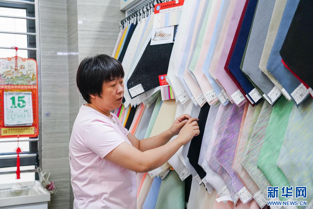 晋江国际鞋纺城里,一位工作人员在整理布料样品(2024年8月15日摄)。新华网 肖和勇 摄