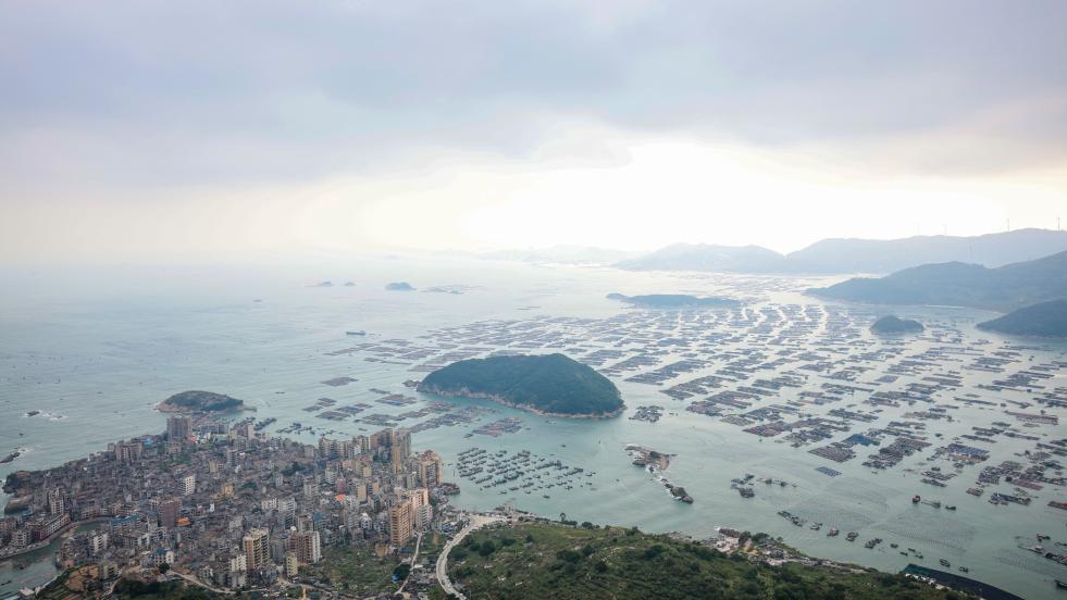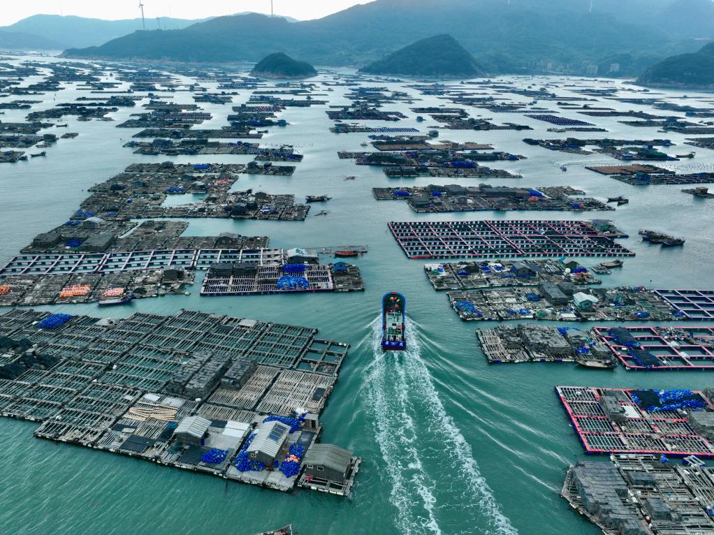 12月4日,渔船在福州市连江县奇达村渔排养殖区行驶(无人机照片)。